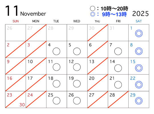 11月の診療予定です。28日(金)は臨時休診です。 来院をご希望される患者さまはどうぞお早めに予約をお取りくだ …